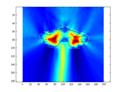 A movie of the evolution of cerebellar lobule 9 according to boundary-specific speeds. The vector field shown by red glyphs influences the red portion of the boundary, while the blue spotlights influence the blue portion of the object boundary.